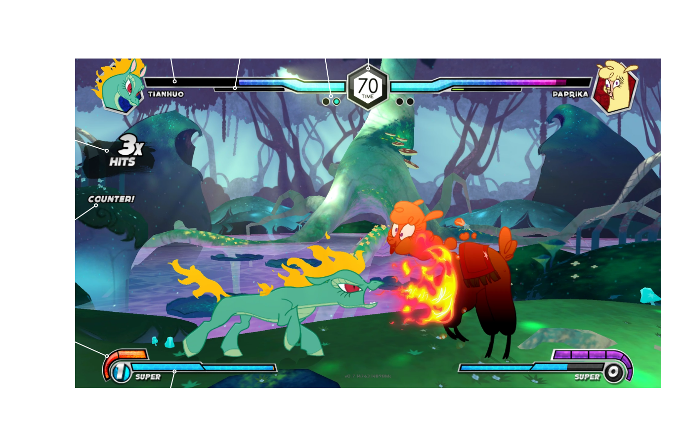 Online play in Them’s Fightin Herds features peer-to-peer rollback netcode (instead of delay-based). This allows for seamless, nearly lag-free fighting.
